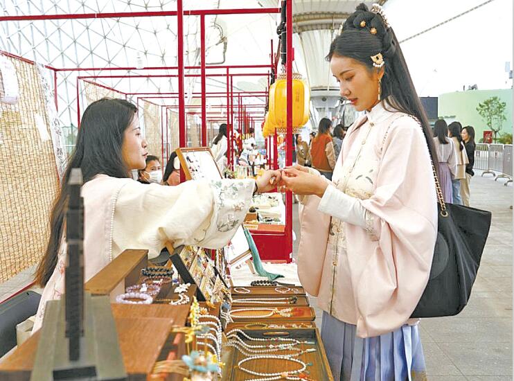 4月11日,华服爱好者在上海“世博源”的国风市集上挑选饰品。新华社记者 刘颖 摄
