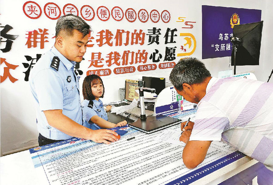 5月17日,乌苏市公安局交警大队车管所民警在夹河子乡便民服务中心为群众办理车驾管业务。 齐兵鑫 摄