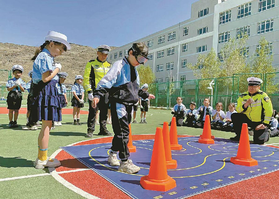 近日,青河县公安局交警大队在青河镇第三小学开展交通安全教育活动,通过互动体验、现场模拟等方式让学生们学习交通安全知识。图为学生戴上“醉酒眼镜”尝试沿着地垫线路行走,体验饮酒后的眩晕感,了解醉驾的危害性。 恰暑·奥开特 摄