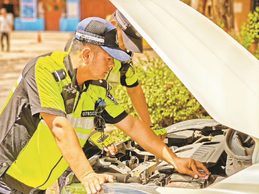 6月24日,吐鲁番市高昌区公安局交警大队民警帮助群众排除因高温造成的车辆故障。