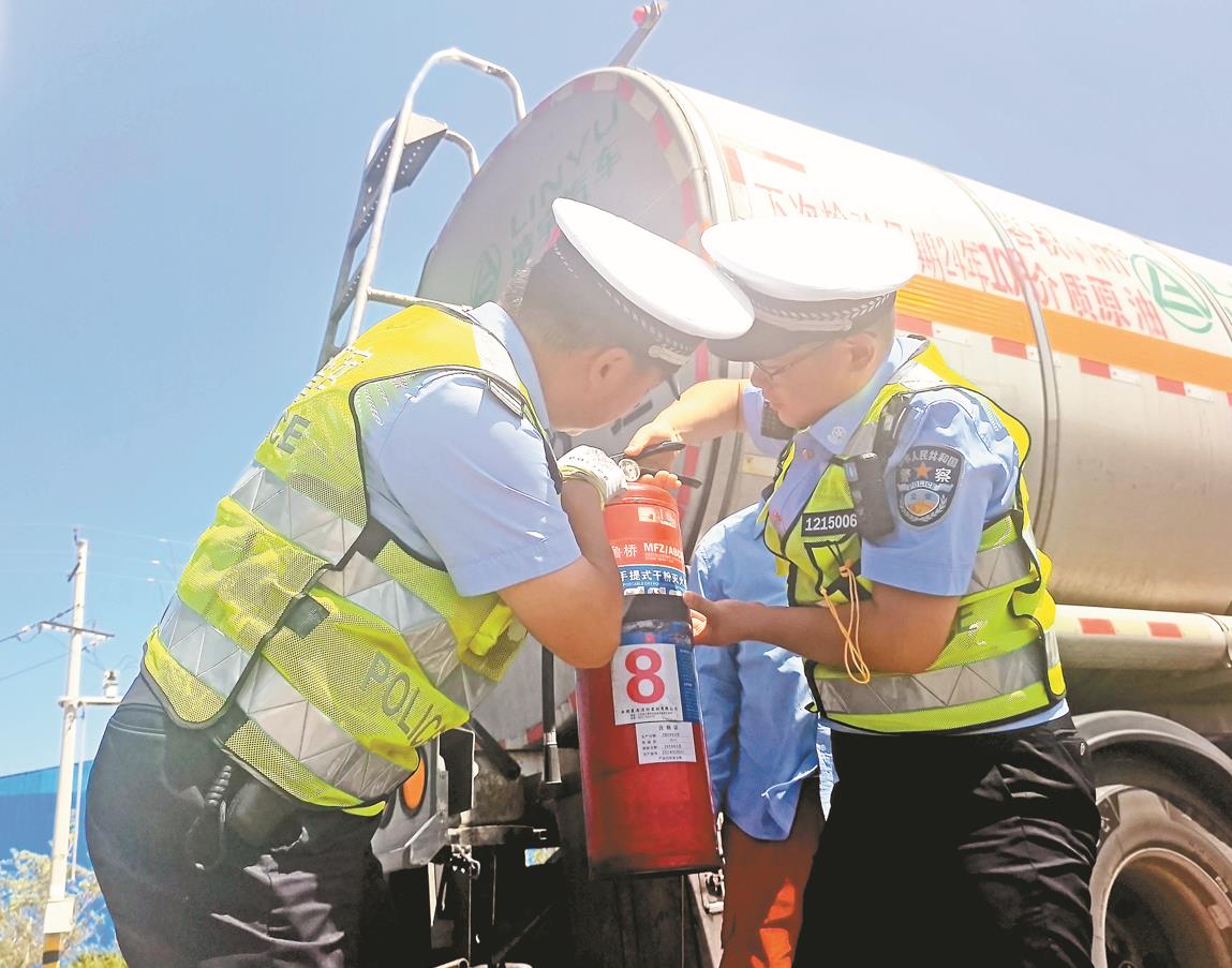 6月24日,吐鲁番市公安局吐哈分局交警支队民警检查危化品运输车配备的灭火器能否正常使用。