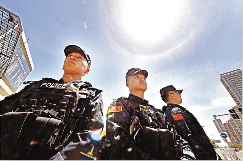 6月27日,乌市公安局特警五支队民警顶着烈日在新疆国际会展中心外执勤。