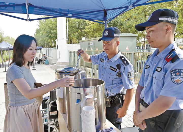 6月26日,乌市公安局水磨沟区分局民警给群众盛绿豆汤。