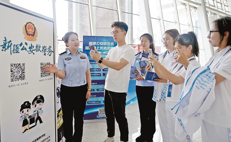 “扫这个二维码,我们帮您。”乌鲁木齐市公安局水磨沟区分局七道湾派出所民警唐玉林快速回答。当日,第八届中国—亚欧博览会向公众开放,顶着35℃的高温为群众服务,不一会儿,唐玉林就满头大汗了。
