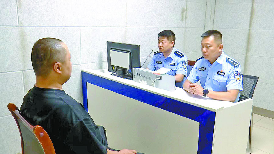 6月30日,乌鲁木齐市公安局沙依巴克区分局平顶山派出所副所长王成龙(右一)和同事在讯问犯罪嫌疑人。 受访单位供图