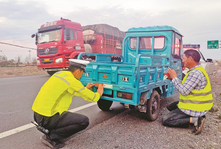 自开展夏季治安打击整治行动以来,克拉玛依市公安局独山子区分局九公里交警大队在312国道4407公里至4424公里处,采取定点检查与流动巡逻相结合的方式,对三轮电动车及电动自行车加大检查力度,提醒驾乘人员戴好安全头盔,同时免费为车辆粘贴反光贴。