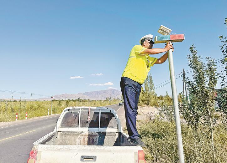 8月28日,伊宁县公安局交警大队民警在G218线检查交通安全爆闪灯运行情况。 曼则兰木·木扎合买提 摄
