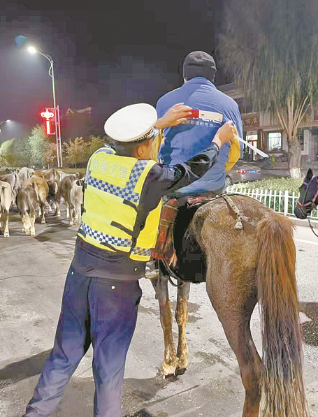 近日,新源县境内牧民转场活动频繁。因夜间视线差,牧民及牲畜在道路上行进时,不易被发现,存在安全隐患。10月15日,新源县公安局交警大队民警来到辖区重点路段,为牧民背部粘上反光贴,保障其出行安全。 马燕 摄