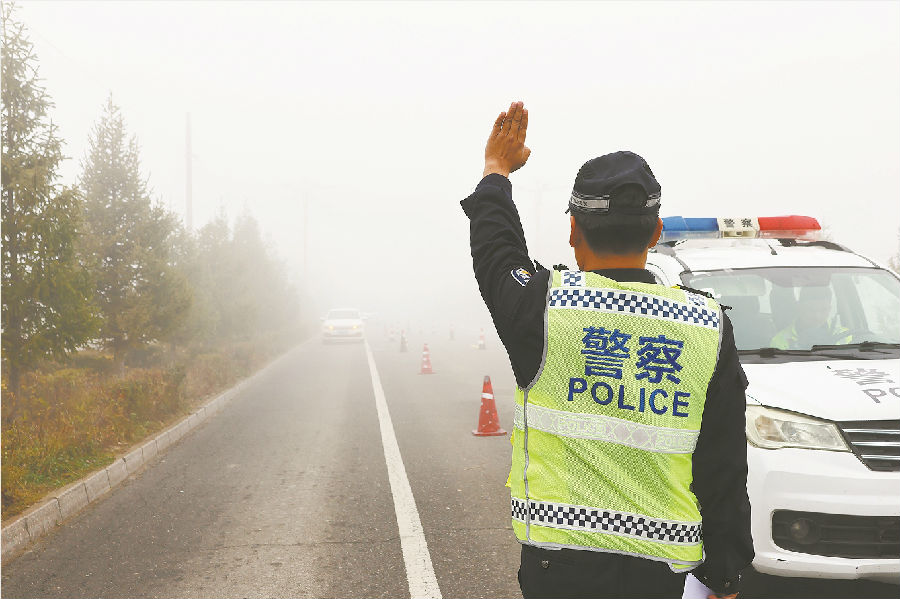 10月23日,温泉县辖区出现大雾恶劣天气,部分路段能见度不足50米。温泉县公安局交警大队立即启动恶劣天气应急预案,全员上路执勤,迅速疏导交通,加强巡逻管控,全力消除道路隐患。 时磊 摄