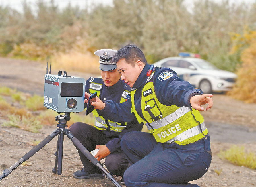 10月29日,昌吉回族自治州公安局准东经济技术开发区分局交警大队民警利用移动测速设备查处机动车超速交通违法行为。