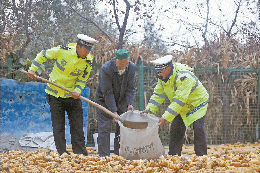 10月28日,在乌恰县波斯坦铁列克乡居鲁克巴什村村民艾海提·买买提家,该县公安局交警大队民警帮忙将晾晒的玉米装袋。