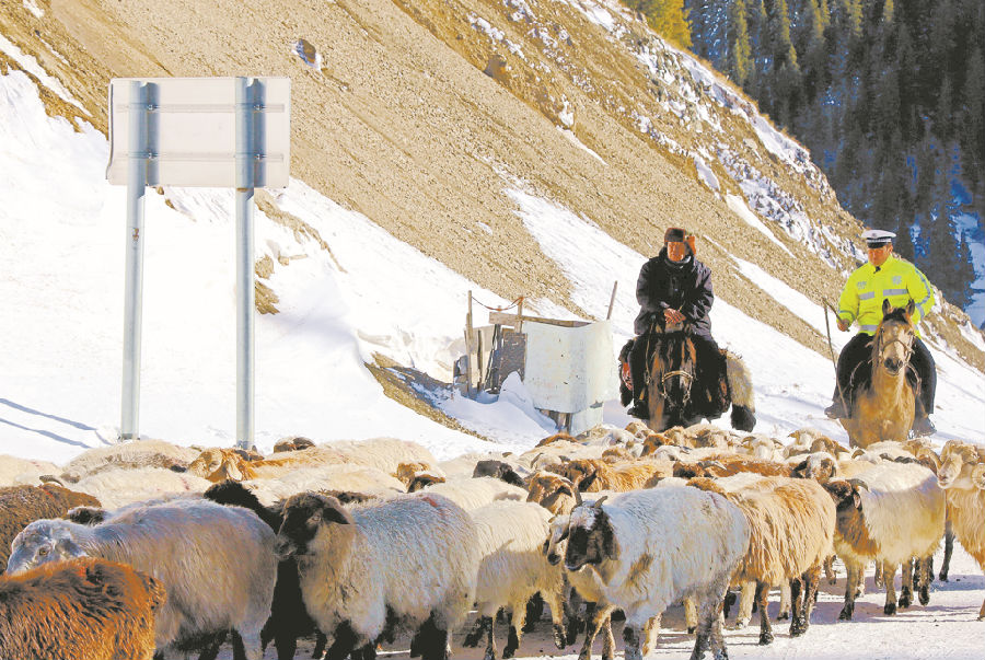 11月17日,温泉县公安局交警大队民警帮牧民驱赶羊群。 艾丽飞亚·亚尔买买提 摄
