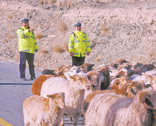 11月18日,博湖县公安局交警大队民警巡逻时,看见牧民赶着羊群走在国道上,车来车往间极易发生道路交通事故。民警迅速上前了解情况,得知该县乌兰再格森镇乌图阿热勒村牧民格某要将羊群转至23公里外的博斯腾湖乡冬牧场。