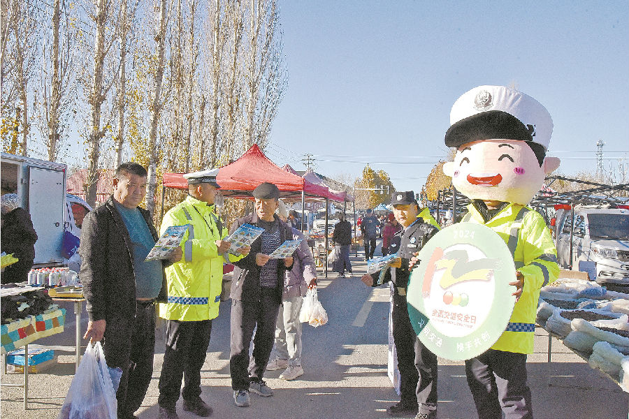 活动期间,民警化身“人偶萌警”,结合冬季交通安全形势及辖区群众出行特点,通过发放宣传单、现场答疑等形式,向群众普及驾驶农用三轮车、老年代步车、电动自行车的注意事项,讲解农用车违法载人、超员超载、酒驾醉驾、疲劳驾驶等交通违法行为的危害性,提醒群众主动遵守道路交通法规,自觉抵制交通陋习,做到安全驾驶、文明出行。图为民警向过往群众发放宣传单。 王博 摄