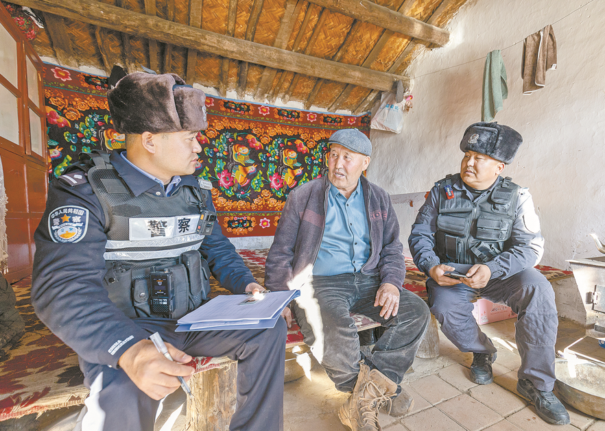 杜文豪(左一)和同事到牧民家中走访。 芦胜磊 摄