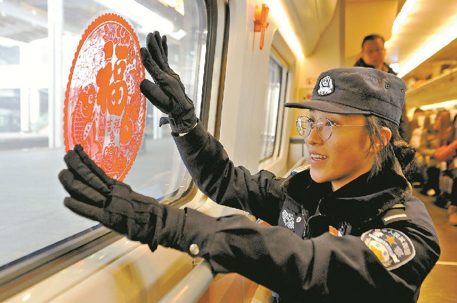 “丝路风华”女子乘警组乘警冷艳贴福字装饰车厢。