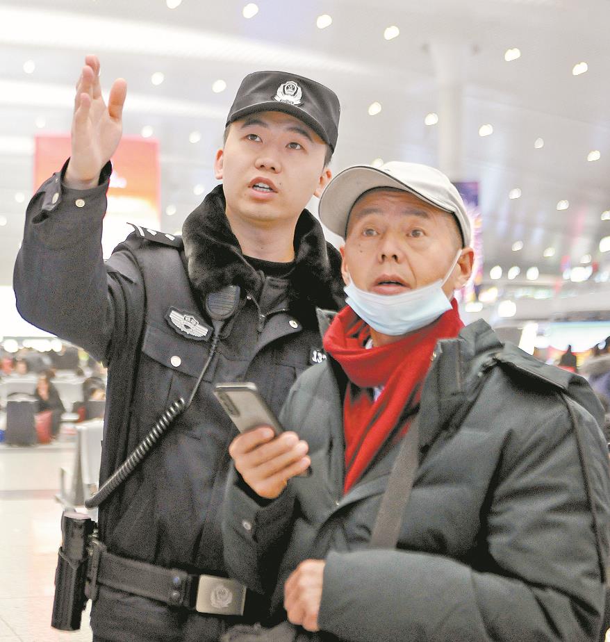 乌鲁木齐站派出所民警杨疆峰为旅客指路。