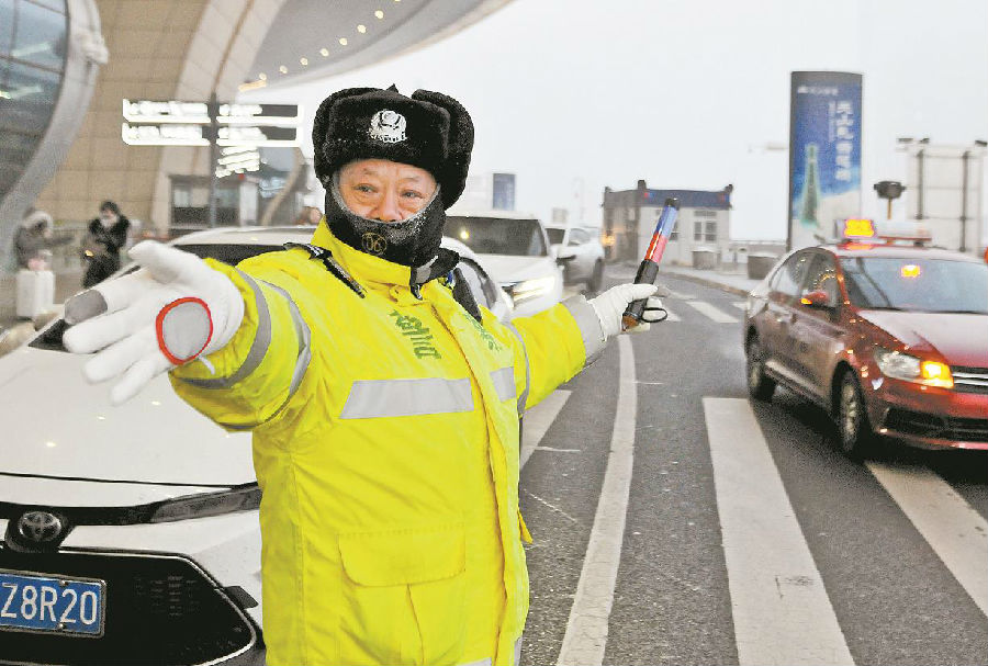 半个多小时前,姚永亮就站在零下15摄氏度的户外指挥交通。脸颊冻得通红,帽子上也结了厚厚的白霜。车流中,姚永亮身上的荧光绿格外耀眼。