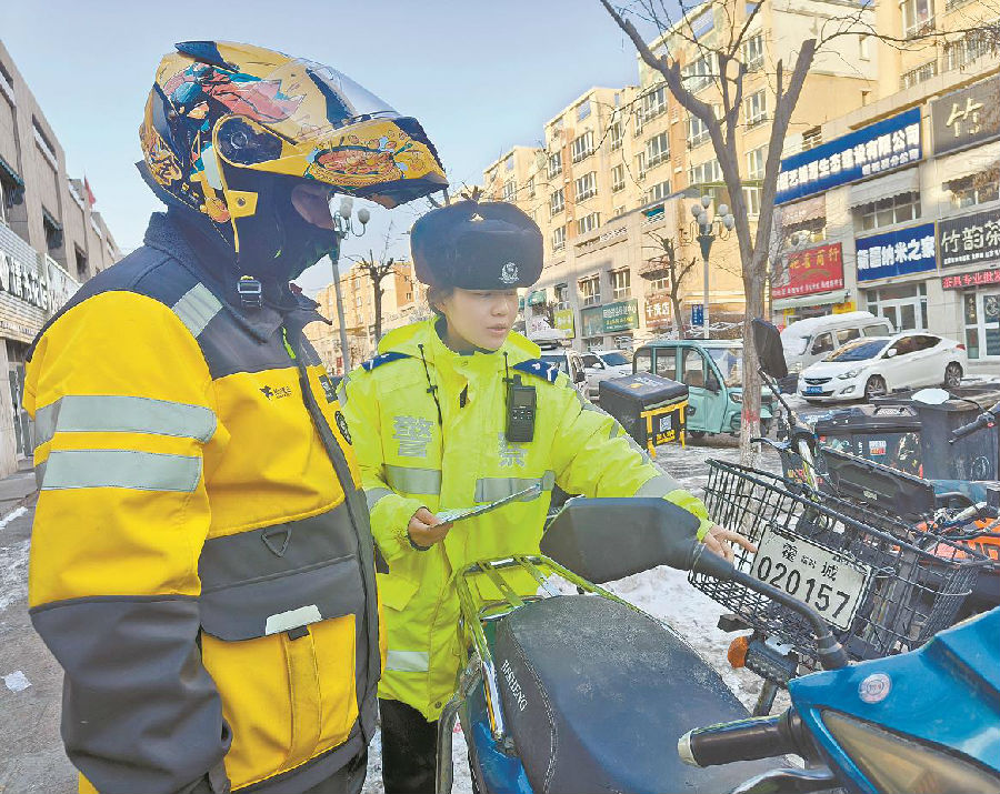 2月17日,霍城县公安局交警大队开展摩托车、电动车交通违法专项整治行动。民警结合摩托车、电动车出行规律及特点,采取流动巡逻与定点检查相结合的方式,紧盯摩托车、电动车骑乘人员不戴安全头盔、不按规定车道行驶、逆向行驶、无牌无证、违法载人、非法改装等违法行为,做到发现一起、查处一起,最大限度消除风险隐患,预防和减少道路交通事故发生。图为民警来到外卖配送站点,向外卖骑手讲解交通违法行为的危害。 巴克尔·库尔曼江 摄