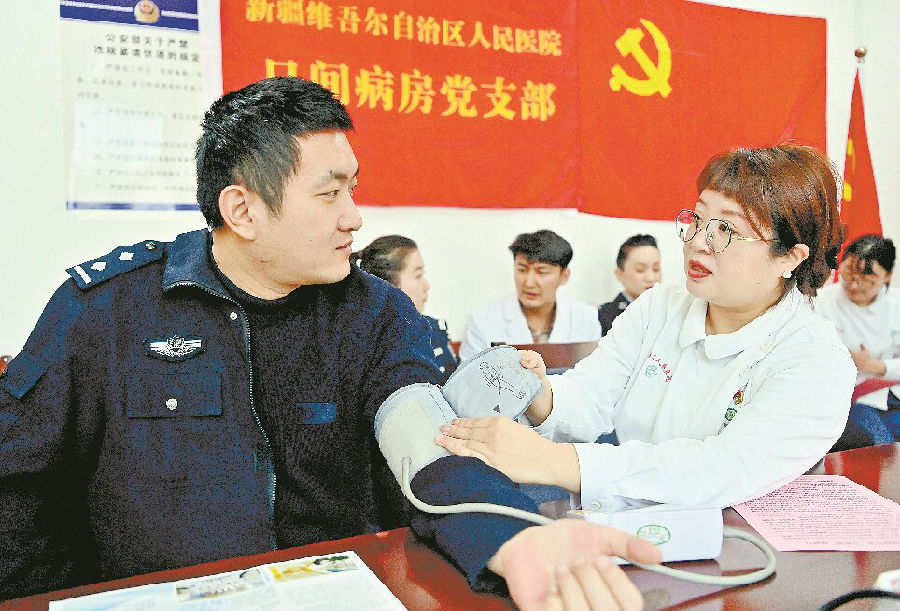 3月5日,自治区人民医院医护人员来到乌鲁木齐市公安局沙依巴克区分局扬子江路派出所开展义诊活动,为民辅警提供健康咨询和免费医疗服务。图为医护人员询问民警的健康状况并为其测量血压。 石榴云/新疆法治报记者 单坤 摄