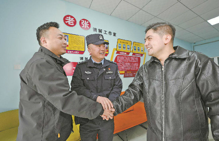 3月2日,新城派出所民警调解一起经济纠纷,双方当事人握手言和。 许正平 摄