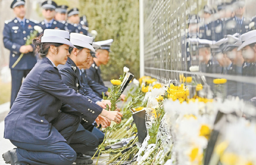 A+ | a4月2日,乌鲁木齐市公安局交警支队城市快速路大队举行“缅怀公安英烈 无悔藏蓝青春”清明祭扫活动,民警来到乌鲁木齐市革命烈士陵园,为公安英烈献花。