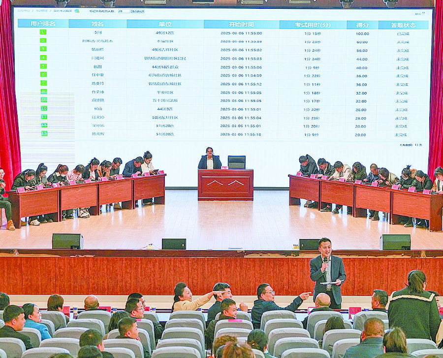 第三师图木舒克市参与竞赛的选手正在答题,大屏上实时显示选手成绩。石榴云/新疆法治报记者 房佳伟 摄