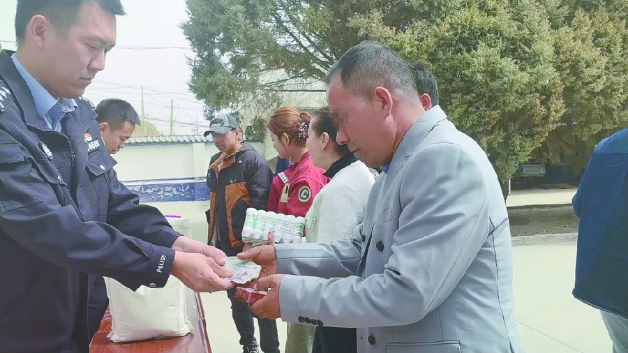 4月6日,温宿县公安局恰格拉克派出所向被骗群众返还涉案现金及商品。 熊凯 摄