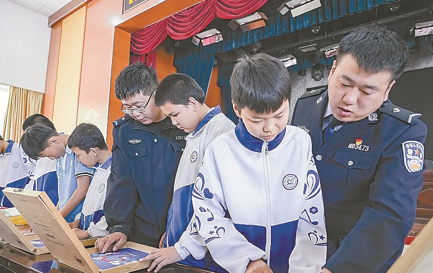 5月8日,在乌鲁木齐市第100中学,辅警通过桌游为学生讲解避险知识。 杨玺琳 摄