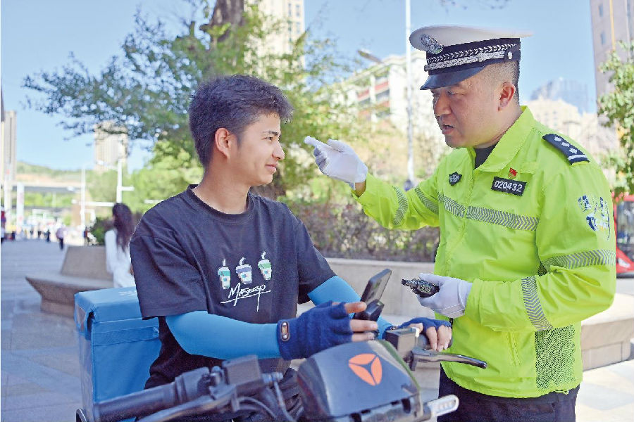 5月22日,乌鲁木齐市公安局交警支队沙依巴克区大队长江路中队民警向外卖小哥讲解不戴安全头盔的危害。随着气温升高,部分外卖小哥为图一时凉快,骑行时不戴安全头盔,对此,该大队民警走上街头,为外卖小哥普及交通安全知识,引导他们遵守交通法规。 石榴云/新疆法治报记者 单坤 摄
