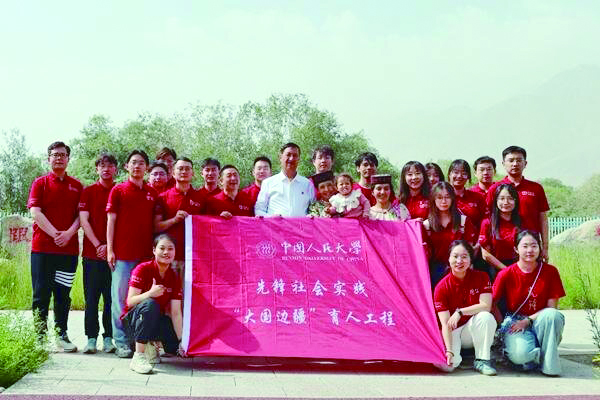 中国人民大学国际关系学院“大国边疆”新疆实践团与中国人民大学荣誉辅导员龙吉克·卡德尔合影留念。