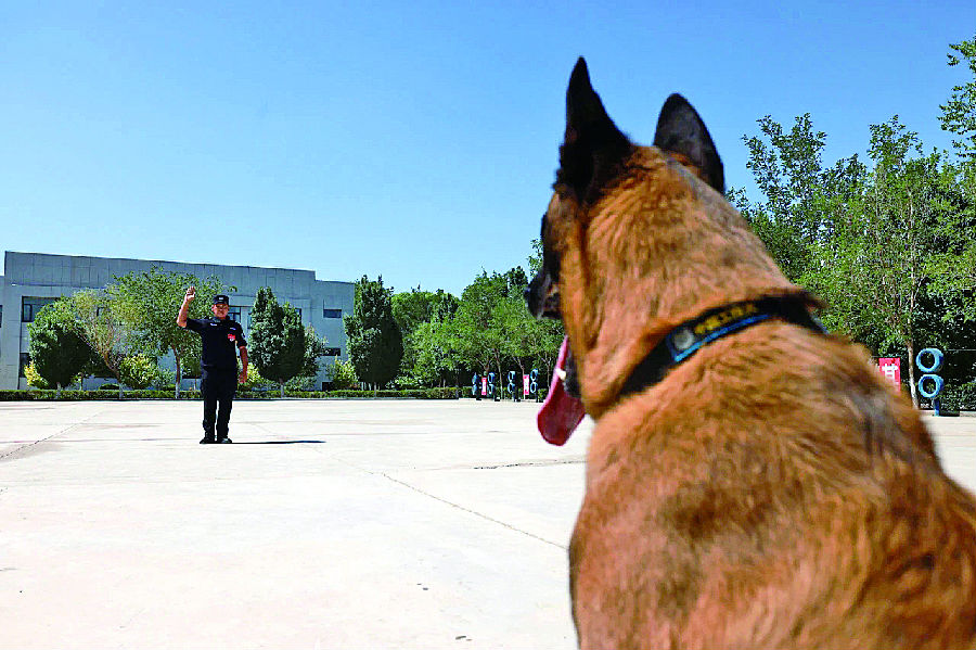 日常训练中,警犬“路飞”全神贯注等待训导员阿布力克木·阿布都力的指令。 邓弟红 摄