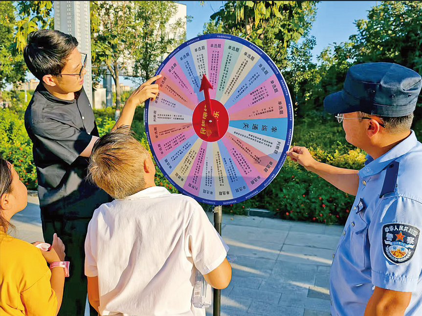 7月25日,在第七师胡杨河市祥云湖公园,师市公安局嵩山路派出所联合胡杨街道办摆起“反诈地摊”,通过互动游戏、有奖问答等形式,在寓教于乐中加深群众对反诈知识的理解。图为群众参与有奖问答。 李倩茹 摄
