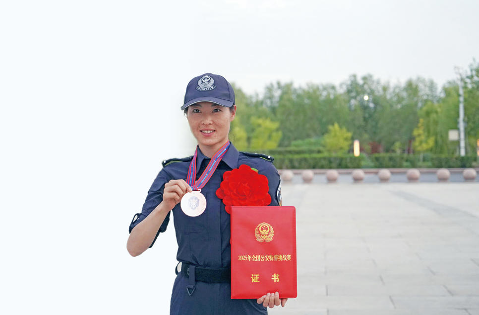 张筱娟展示“尖刀·使命”2025年全国公安特警挑战赛奖牌和证书。受访单位供图