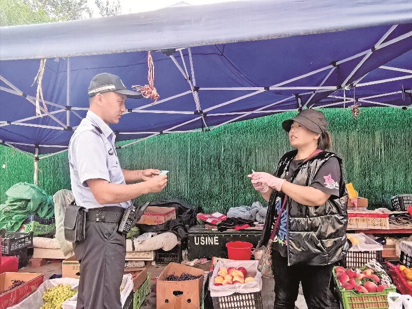 为了守护这份烟火气,阿克齐镇派出所在市场核心区域设立综合市场便民警务站,还制作了5000余张警民联系卡,上面印着便民警务站民辅警的姓名和电话,发到每一位经营户手中。