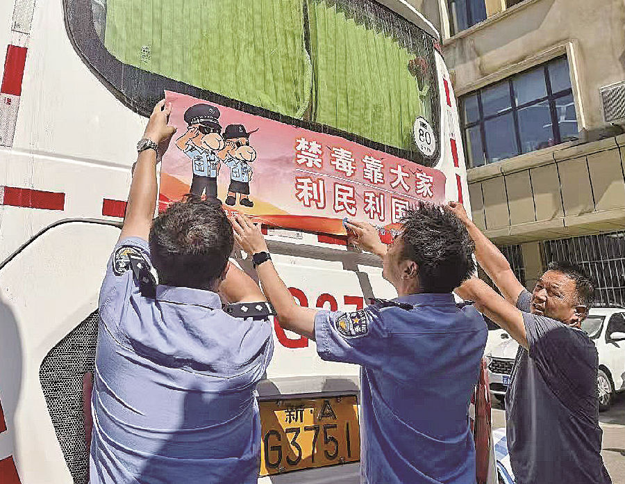 8月1日,乌鲁木齐第一强制隔离戒毒所禁毒法治宣讲小分队民警在辖区线路班车上张贴禁毒宣传海报。 潘林 摄