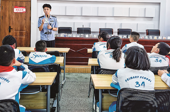 9月1日,乌鲁木齐第一强制隔离戒毒所民警走进乌鲁木齐市第34小学开展“开学第一课”活动。 马子豪 摄