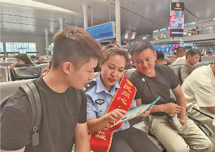 6月23日,乌鲁木齐第一强制隔离戒毒所民警在乌鲁木齐站向旅客宣讲禁毒知识。 马子豪 摄