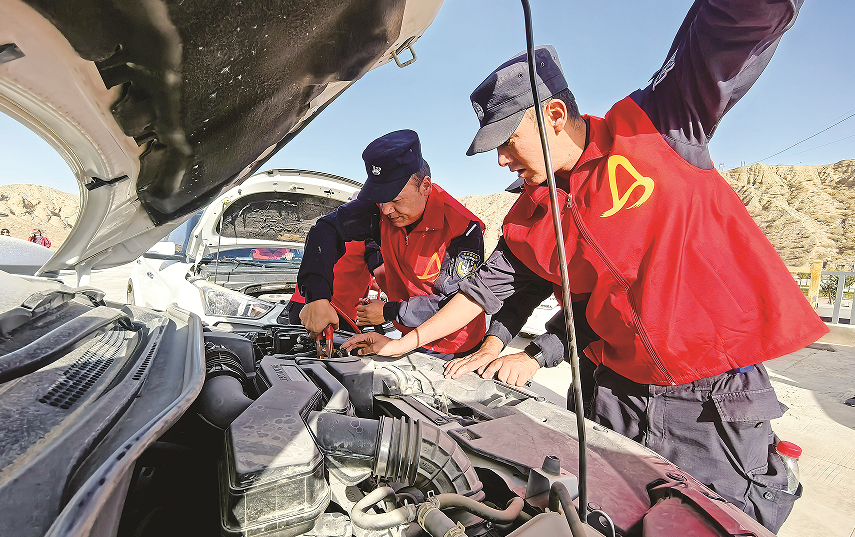 “天门救援服务队”民辅警帮游客修车。石榴云/新疆法治报记者 郑旭磊 摄