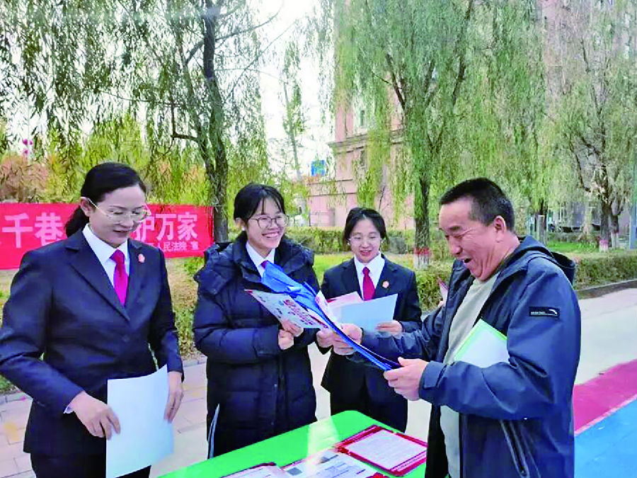 近日,兵团三坪垦区人民法院在第十二师三坪农场融合社区开展普法宣传活动。法院干警围绕婚姻家庭、邻里纠纷、防范诈骗、未成年人权益保护等方面法律问题展开讲解,以通俗易懂的语言和生动有趣的案例普及法律知识,提高群众风险识别能力和自我保护能力。 卓诗韵 摄