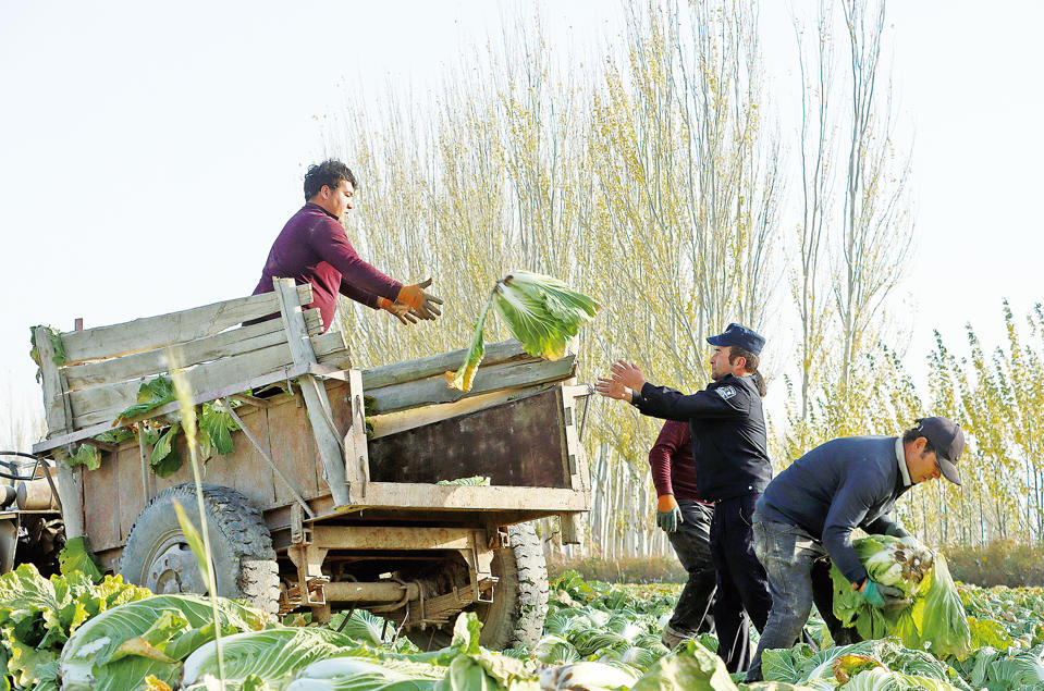 10月29日,博湖县公安局塔温觉肯乡派出所辅警帮助菜农装车。