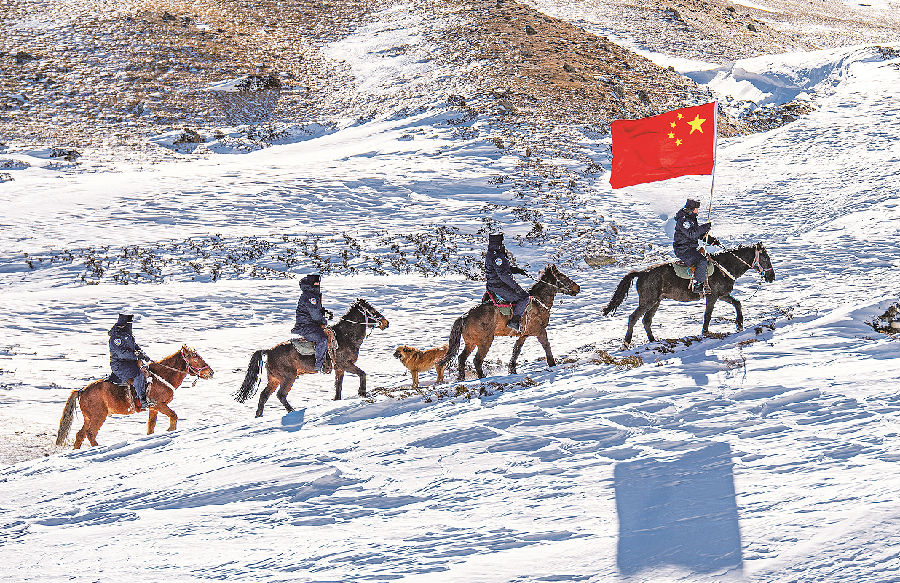2024年11月,阿思里别克(右一)带领卡昝河边境警务站马巡分队巡边踏查。