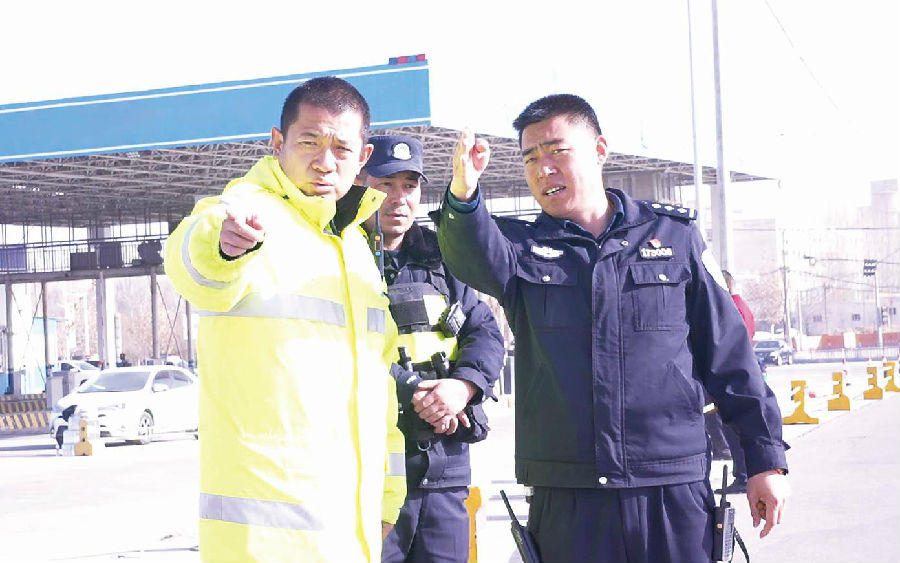 12月10日,徐潇(左一)在和田市一处施工现场疏导交通。 受访单位提供