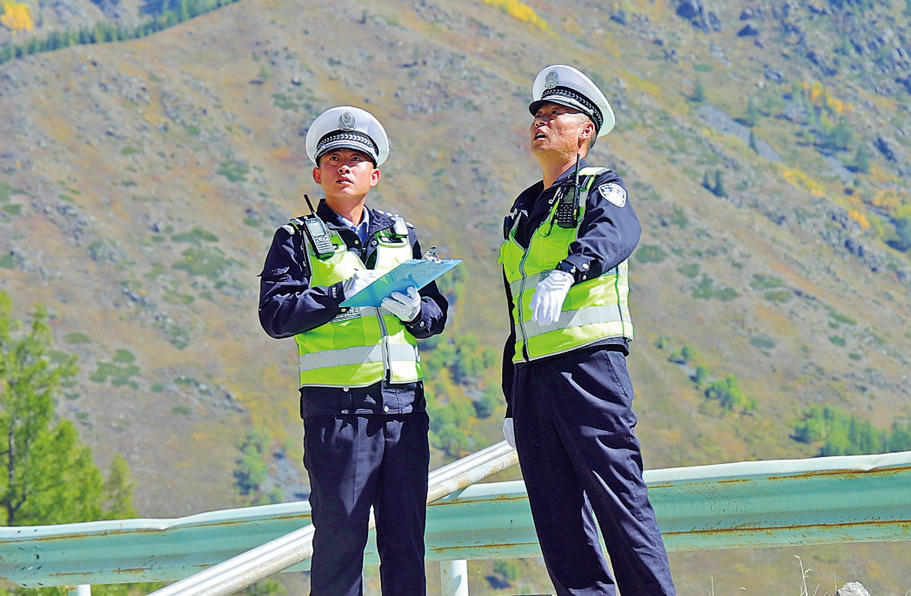12月25日,喀纳斯景区,阿勒泰地区公安局喀纳斯景区分局交管大队大队长曹建强穿梭在人群车流中,时而俯身叮嘱驾驶员安全驾车,时而为游客指引方向。