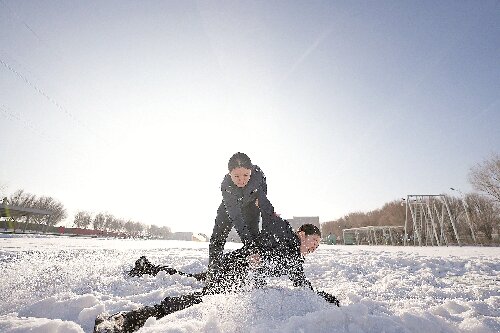1月10日,乌市公安局特警特战支队民警王志成进行摔柔训练。