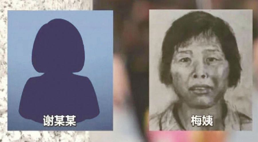 专案组发现谢某某就是“梅姨”,右图是广州警方绘制的“梅姨”第一张模拟画像。