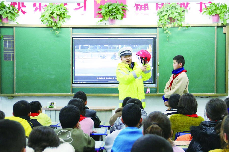 针对学生群体出行特点,民警以案说法,向学生们介绍交通违法行为的危害性,引导学生们自觉遵守交通安全法规,不在路上嬉戏打闹,确保假期出行安全。图为民警向学生们讲解骑乘电动车戴头盔的重要性。 李超 摄