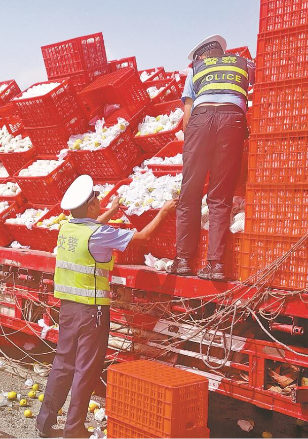 为防止发生二次事故,民警一边指挥引导过往车辆避让,一边帮忙捡拾地上的香梨,3个小时后,装载香梨的货筐再次整齐叠放在车厢里。
