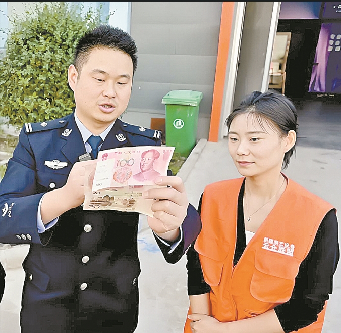 9月20日,在乌市米东区工业园区,乌市公安局米东区分局经济犯罪侦查大队民警向工作人员介绍识别假币的方法。 吴成渝 摄