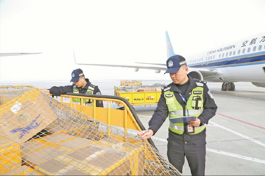 11月28日,乌市公安局机场分局民警检查航班运载货物。 王梓瑞 摄